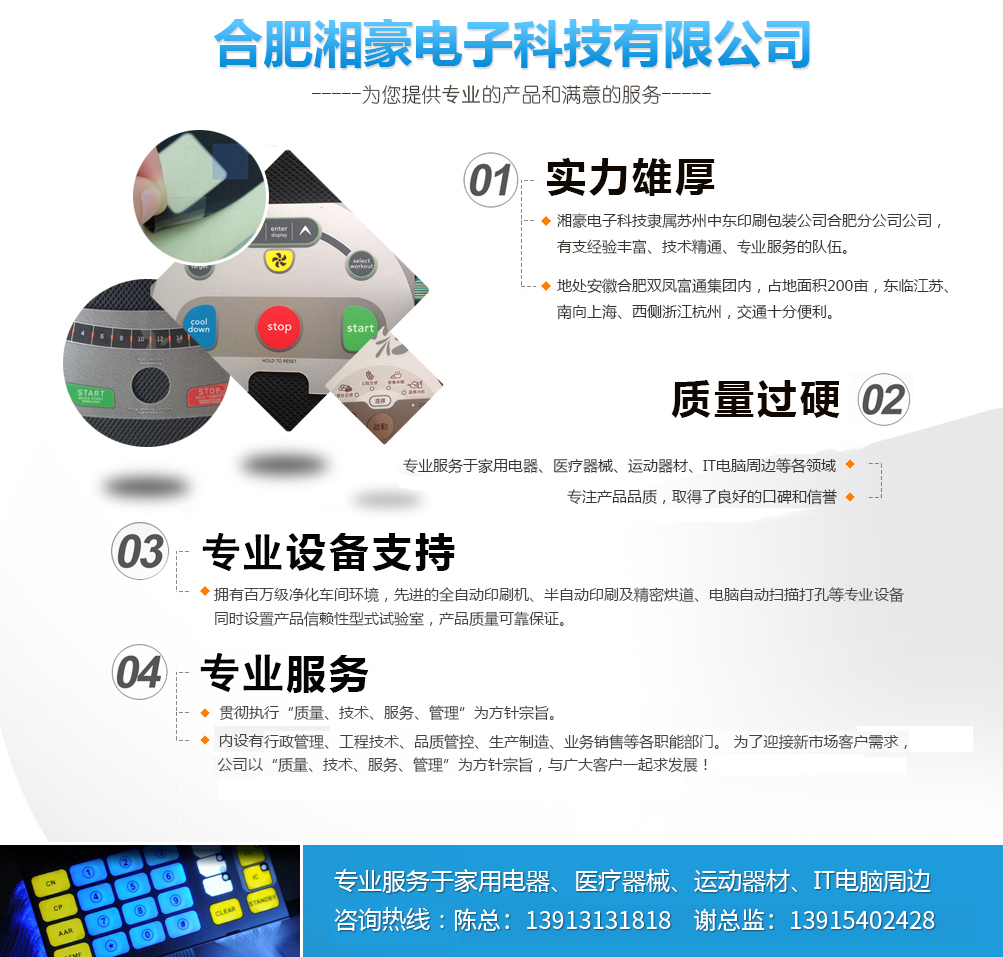 公司簡介 合肥湘豪電子科技有限公司系香港中意國際集團股份有限公司(1998年創(chuàng)建)下屬企業(yè),關(guān)系企業(yè)有:東莞中意塑膠制品有限公司(1996年創(chuàng)建),蘇州中意塑膠制品有限公司(2003年創(chuàng)建),蘇州中東包裝印刷有限公司(2007創(chuàng)建),蘇州捷瑞達自動化科技有限公司(2014年創(chuàng)建),東莞唯道實業(yè)有限公司(2014年創(chuàng)建),合肥六九機器人自動化科技有限公司(2015年創(chuàng)建);合作企業(yè)有:香港富通工業(yè)集團。 公司總部設(shè)在經(jīng)濟發(fā)達的香港,總公司這十幾年來先后在東莞,蘇州投資設(shè)廠,為滿足合肥市場廣大客戶的需求,總公司于2015年與香港富通工業(yè)集團合作在合肥投資設(shè)廠,打造電器控制面板,薄膜開關(guān)業(yè)界的航空母艦,創(chuàng)造專業(yè)產(chǎn)品,樹立精品觀念,鍛造高品質(zhì)、高服務(wù)的企業(yè)形象,樹立正確的核心價值觀。全心全意為國內(nèi)外品牌企業(yè)服...榮譽資質(zhì)